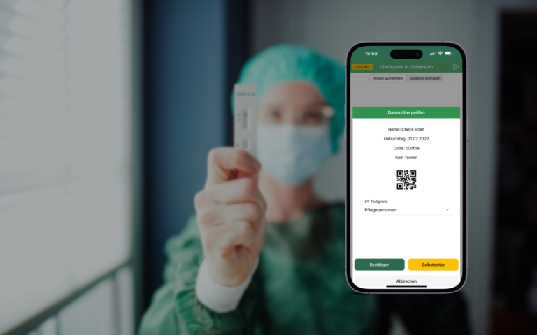 Vor Ort in den Teststellen war unser Personal sowohl mit Smartphones als auch Tablets ausgestattet. Mit einer Scan-Funktion in Checkpoint wurden die QR-Codes gescannt und in der Software in gekürzter Form angezeigt. Anschließend wurden die Daten mit einem gültigen Ausweis verglichen. Außerdem wurde beim Einscannen des QR-Codes dieser einmal ausgedruckt und auf einen neuen Teststreifen geklebt.